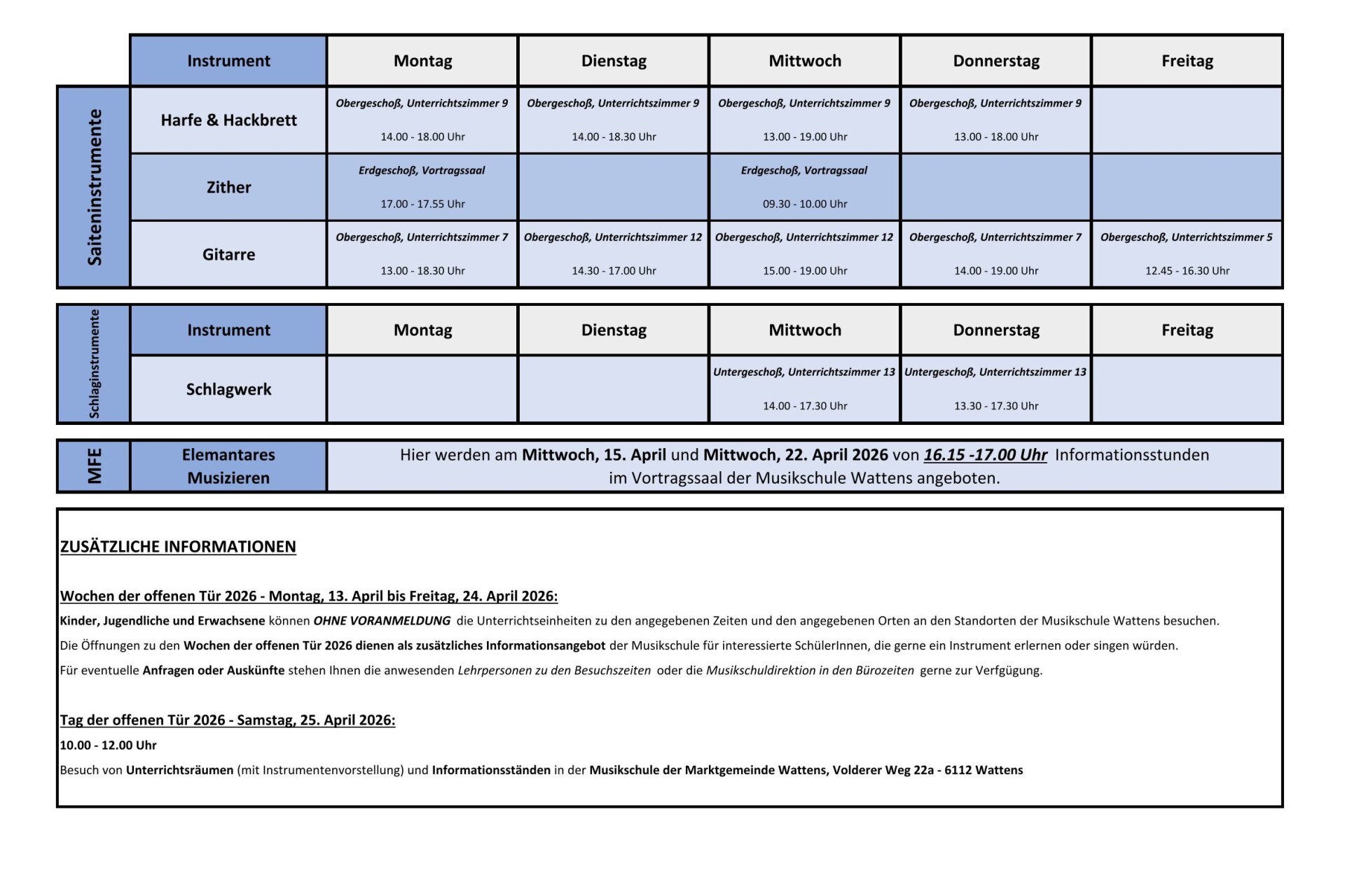 Interessierte Kinder, Jugendliche und Erwachsene können an diesem Tag die Musikschule hautnah erleben und kennenlernen. Lehrpersonen und Verwaltung stehen von 10 - 12 Uhr für Informationen zur Verfügung.